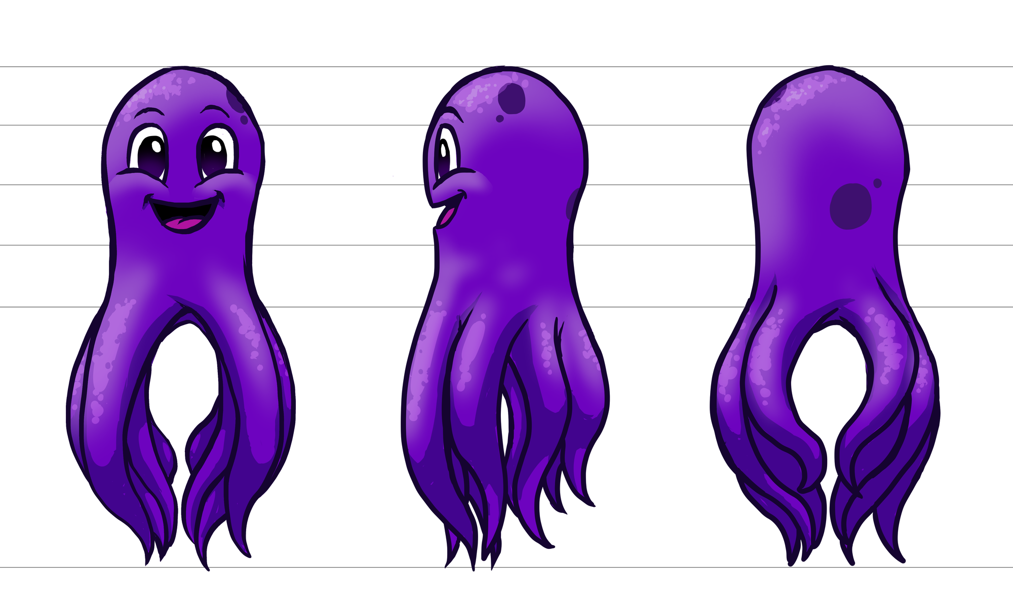 The chosen design ended up being a bit more conservative. It kept the look of the original Octobit but updated him to a more polished and versatile style. His eyes became larger, his proportions elongated, the cyborg aspect was dropped, and the colors gained more depth.